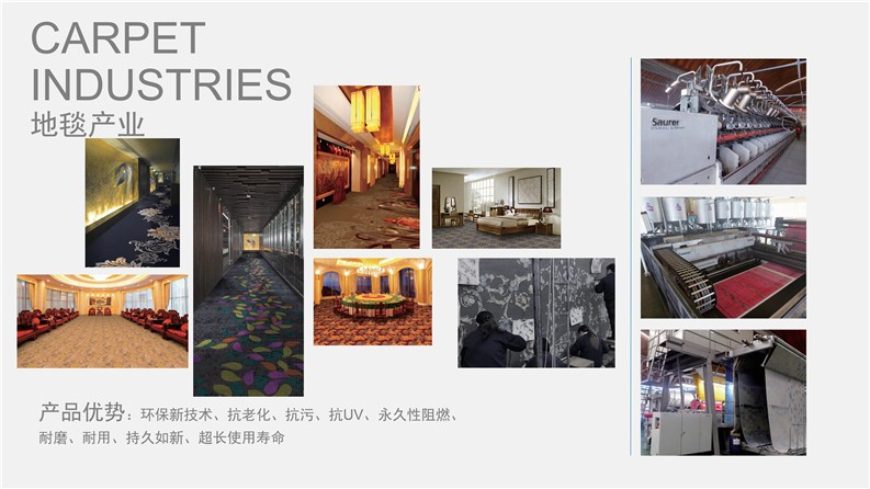 企業擁有眾多國際領先的先進生產設備,其中包括德國威爾頓電腦提花地毯生產線、英國一體化后整理設備、美國多套簇絨地毯生產線、奧地利Zimmer高清印花生產線、BCF滌綸地毯長絲生產線,年產量可生產各類地毯1000多萬平方米,企業自主專利技術研發生產“天絲”特種長絲纖維核心競爭產品,開發多款獨特的高質量產品,具有抗老化、永久性阻燃、耐磨、耐菌、耐污染、持久如新及超長使用壽命等多種優勢性能,是普通傳統纖維絲所無法比擬的,公司通過ISO9001:2000質量管理體系、ISO14001:20004環境管理體系、GB/T28001-2001職業健康安管管理體系認證等,以及先進的生產管理水平,確保地毯產品品質的穩定性和可持續性質量保證。