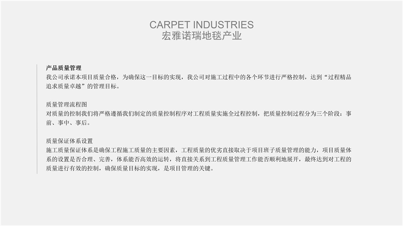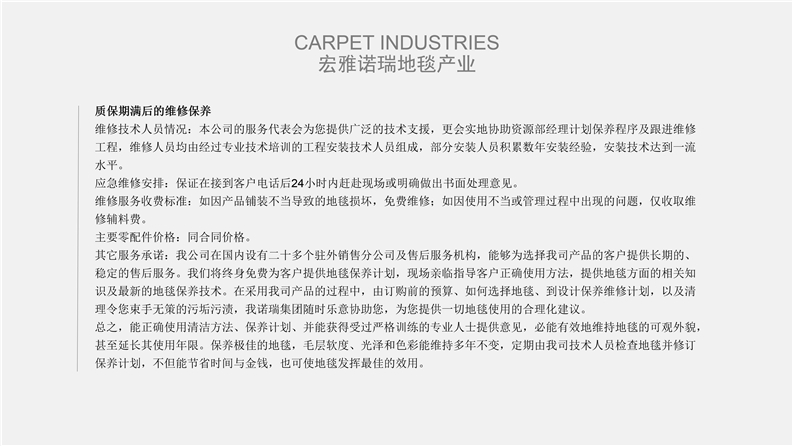 深圳宏雅諾瑞地毯有限公司自2008年創立以來,一直致力于星級酒店、辦公大廈及高端別墅會所提供高品質的產品與優質服務及領先國際水平的售后干洗技術培訓計劃,多年來不斷創新、優化產品結構,一直引領行業發展趨向,宏雅諾瑞地毯產業以綜合性加工生產中高檔機織及手工槍刺地毯為主,集產品研發、設計生產、銷售、鋪裝售后一體化的產業鏈生產企業,企業于2005年在廣州市花都區設立工廠至今,項目輻射全國各地城市地區。